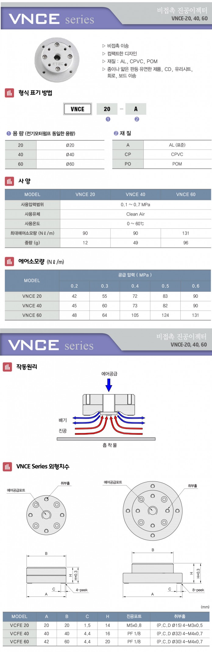 비접촉 진공이젝터 비접촉 이송 컴팩트 디자인 AL, CPVC, POM 재질 종이, 얇은판(유연성) 제품, CD, 유리시트, 회로, 보드 이송 등 적용 |