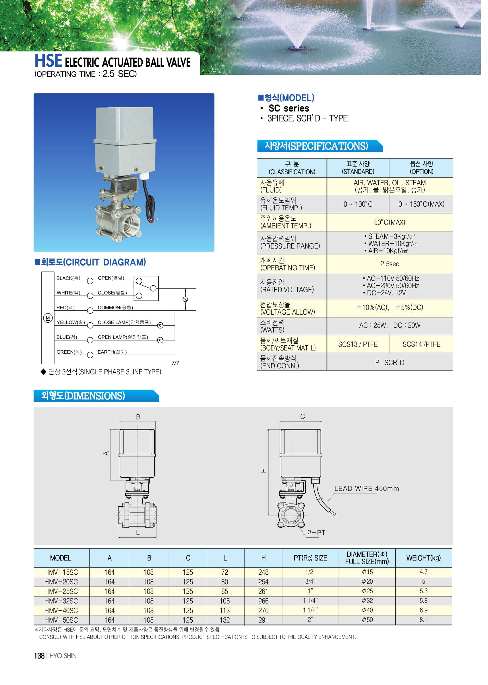 [HMV SC 시리즈] PT(Rc) 1/4'(8A)~2'(50A), 개폐시간 2.5초 / 15초, 공기 물 오일 0~10 kgf/cm2