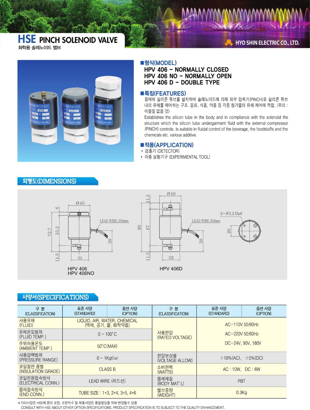 [HPV 406 시리즈] 튜브 1x3, 2x4, 3x5, 4x6 몸체 PBT (화학약품 액체 공기 물) 핀치밸브
