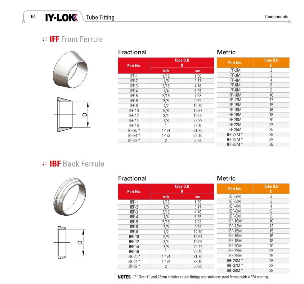 재질: 316 / 316L Stainless Steel 사이즈: 1/8″ ~ 2″, 2mm ~ 38mm Tube OD 최대사용압력: 9,000psig @ 38°C 사용온도: -196°C ~ 648°C 기타: Double Ferrule Compression Tread Types (NPT, PT, PF) |