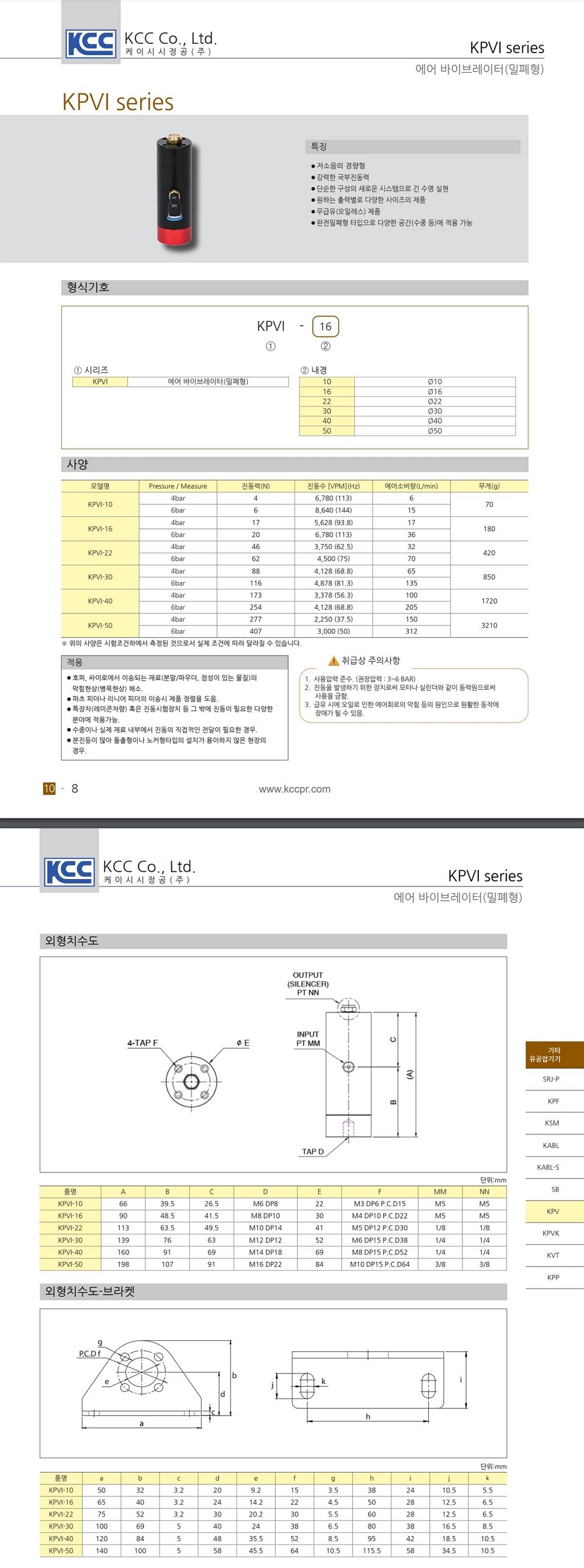 | 체크포인트 | 사용압력 준수, 권장 3~6 bar 진동 발생하기 위한 장치로써 모터나 실린더와 같이 동력원으로써 사용 금함 급유시 오일로 인한 에어회로의 막힘 등 원활한 동작에 장애가 될 수 있음 브라켓은 별매 |
