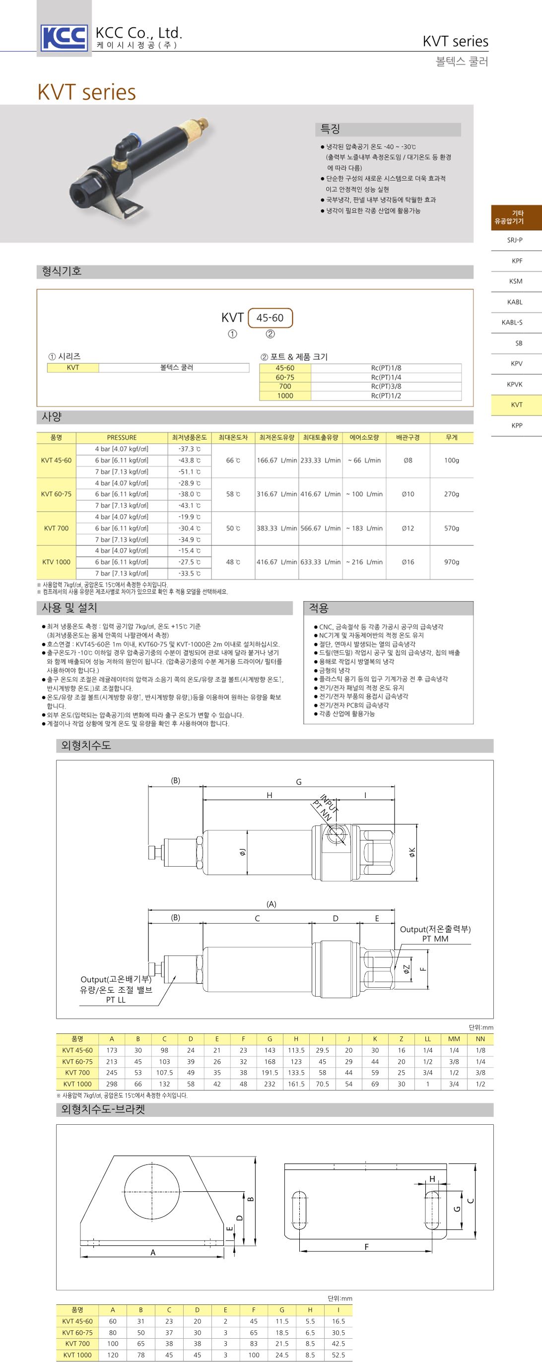 | 체크포인트 | 튜브연결 KVT45 모델은 1미터 이내, 나머지 모델은 2미터 이내로 설치하십시오. 출구 온도가 마이너스 10도 이하일 경우 압축공기 수분 결빙으로 성능 저하 원인이 됩니다. (유수분 제거 드라이어 필터 사용 권장) 사용 및 설치 사항 확인 후 적용 바랍니다. |