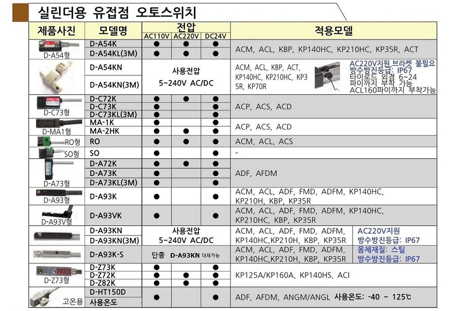 | 체크포인트 | 적용 실린더모델, 부착 방법 참고하시어 선정 바랍니다. 부착형 타입은 실린더 사이즈 맞는 브라켓 별도 구매하셔야합니다. (오토스위치만 교체 제외) |
