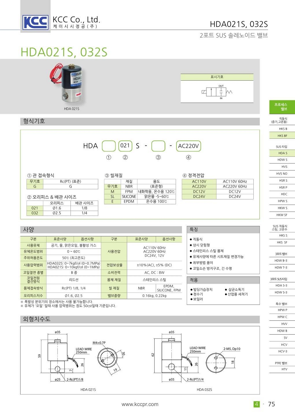 사용유체 공기, 물, 맑은오일, 불활성가스 스테인리스 스틸 몸체 직동식 상시닫힘형 유체사양따른 시트재질 변경 가능 취부방법 용이 코일 소손 방지 구조 및 긴 수명 |