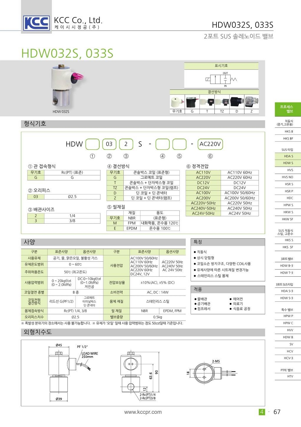 사용유체 공기, 물, 맑은오일, 불활성가스 스테인리스 스틸 몸체, 직동식 상시닫힘형 유체사양따른 시트재질 변경 가능 취부방법 용이 코일 소손 방지 구조 및 긴 수명 |