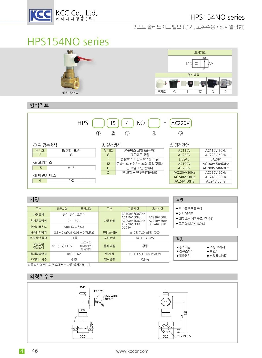 피스톤 파이롯트식 상시열림형 고온형 max 180도 최소작동차압 0.5kgf/cm2 (입구>출구) 필요 코일 소손 방지 구조 및 긴 수명 |