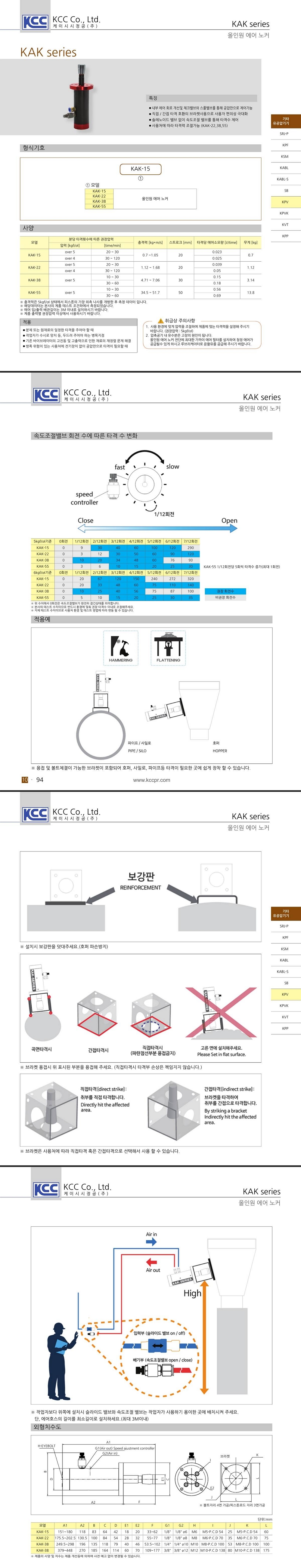 | 체크포인트 | 사용압력 준수, 권장 5 bar 압축공기 유수분 포함은 고장의 원인으로 노커 전단 가까이 필터 및 루브리게이터 설치 분체 타격, 병목 해소 및 재료 정렬, 방폭 지역 공압 타격기 필요 시 적용 |