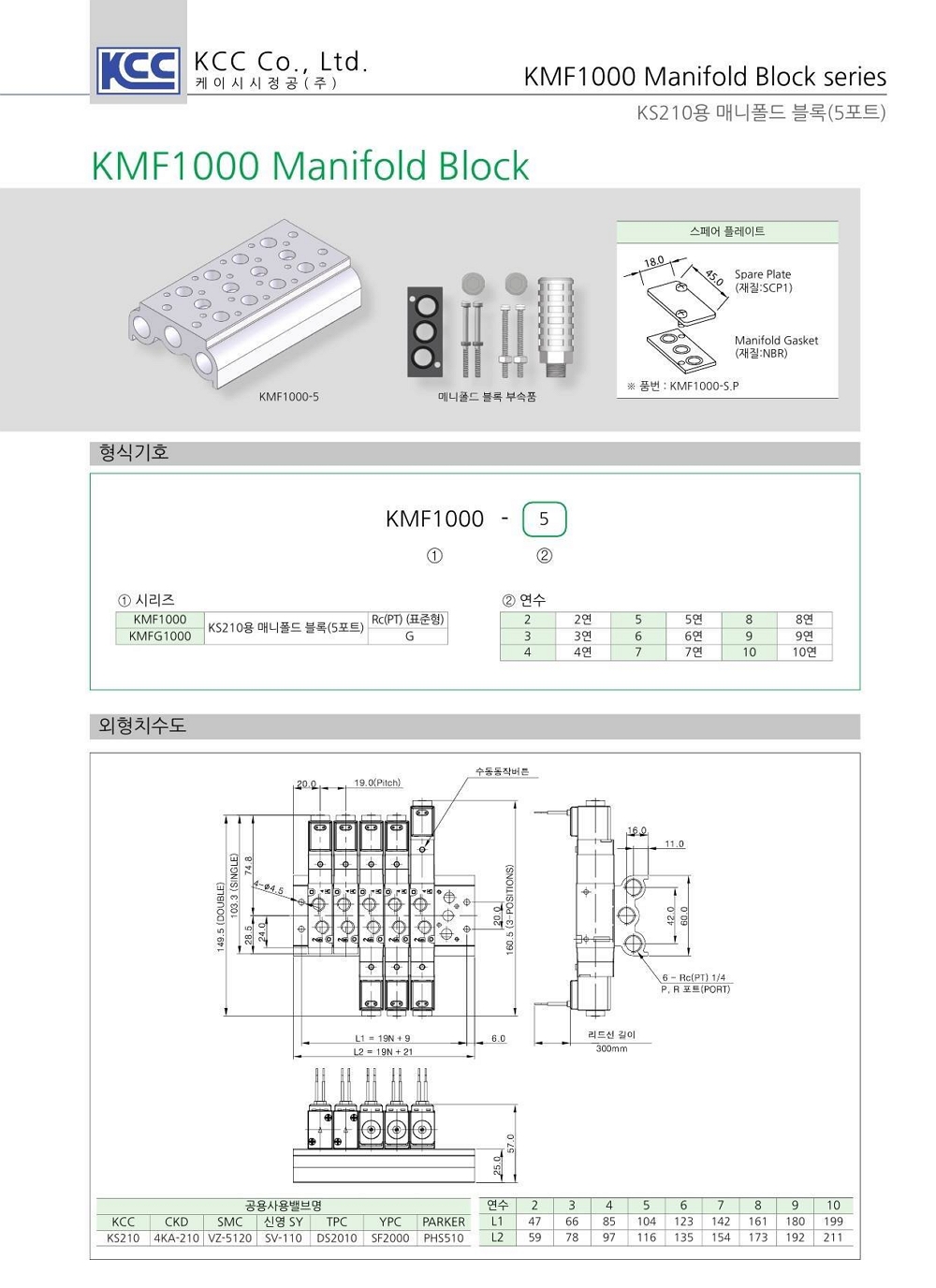 KMF1000 시리즈 KS210 용 매니폴드 블록 Rc(PT) 1/8 (1~10연)