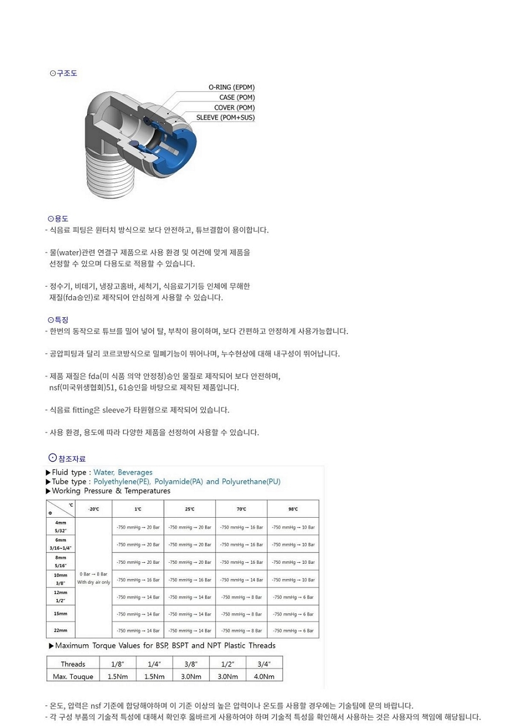 물용 원터치 피팅 물용 배관 사용 원터치식 관연결구 한번 동작 튜브 탈착 용이 HE 시리즈는 인체 무해 재질, NSF(미국위생협회) 승인 받은 제품 |