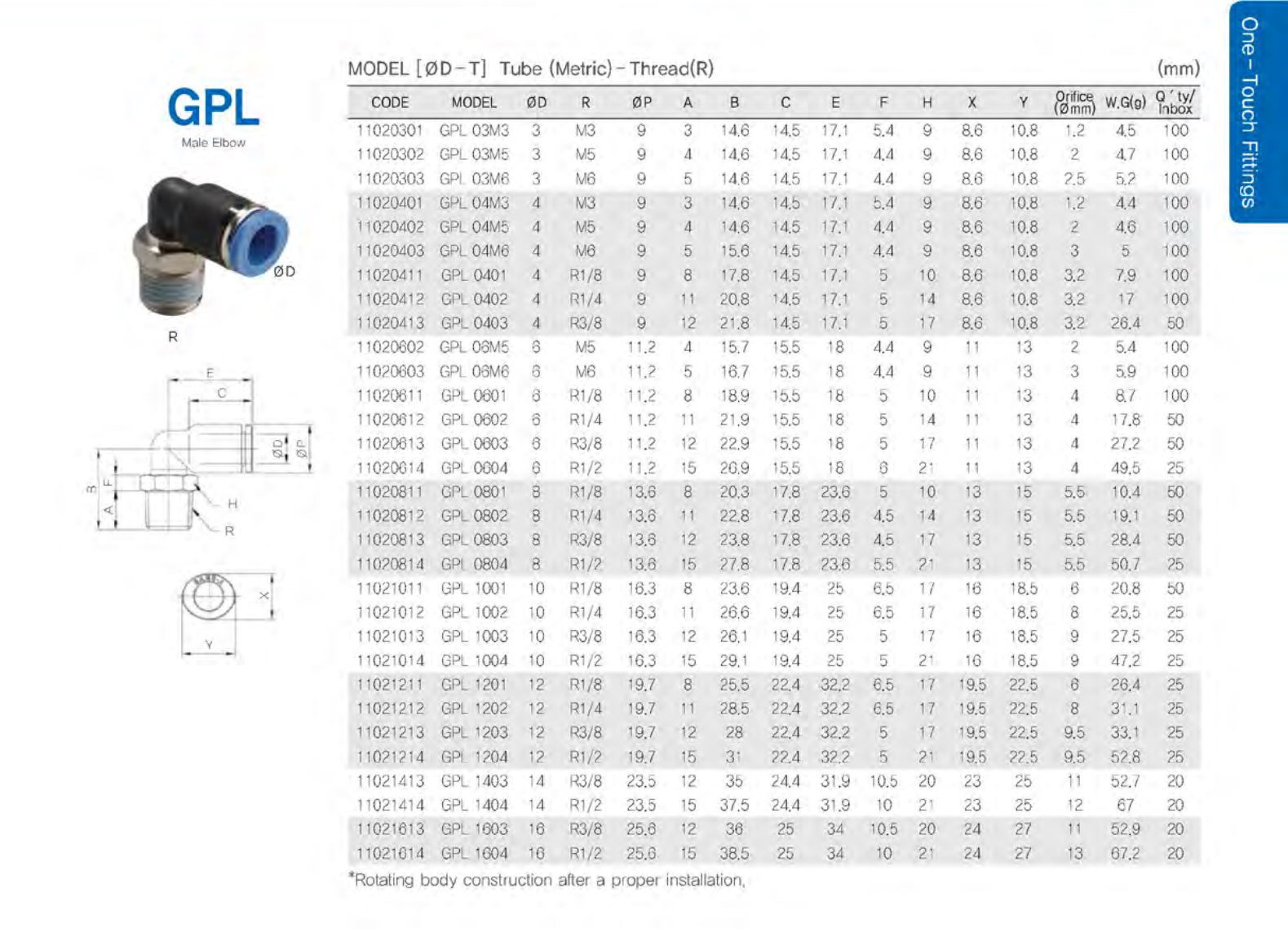 ● 원터치 피팅 One-touch Fitting 튜브를 한동작으로 쉽게 접속할 수 있습니다. PC Type은 내측에 육각렌치의 가공으로 협소한 장소의 배관시에 효율적입니다. 본체가 회전하는 구조이어서 튜브의 배관이 효율적입니다.(Elbow, TEE 형식) 나사부에는 가스켓, 오링 및 테프론 처리가 되어 있습니다. |