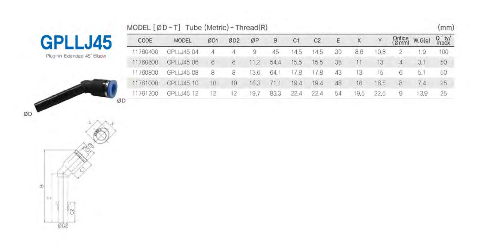 | 체크포인트 | - 사용유체 : 공기 - 사용압력 : 0~284psi / 0~20kgf/cm² - 부압 : -29.5 in Hg / -750 mmHg(-750Torr) - 사용온도 : 32~176°F / 0~83°C - 사용튜브 재질 : Polyurethane and Nylon |