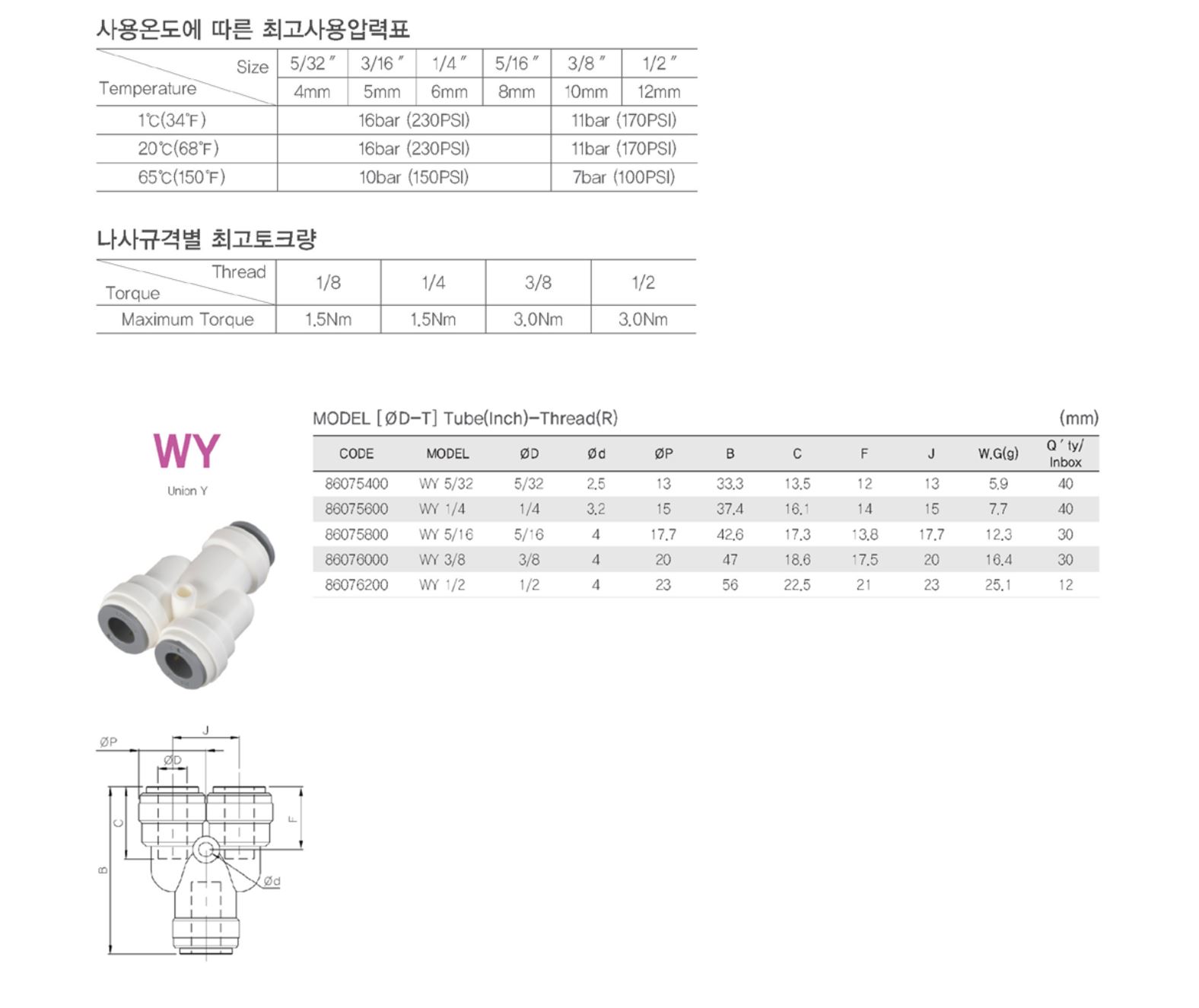 | 체크포인트 | - 사용유체 : 물, 식음료 - 사용압력 : 0~16kgf/cm² - 부압 : -750mmHg(10Torr) - 사용온도 : 0~65°C - 사용튜브 재질 : Polyethylene, Polyamide, Polyurethane |