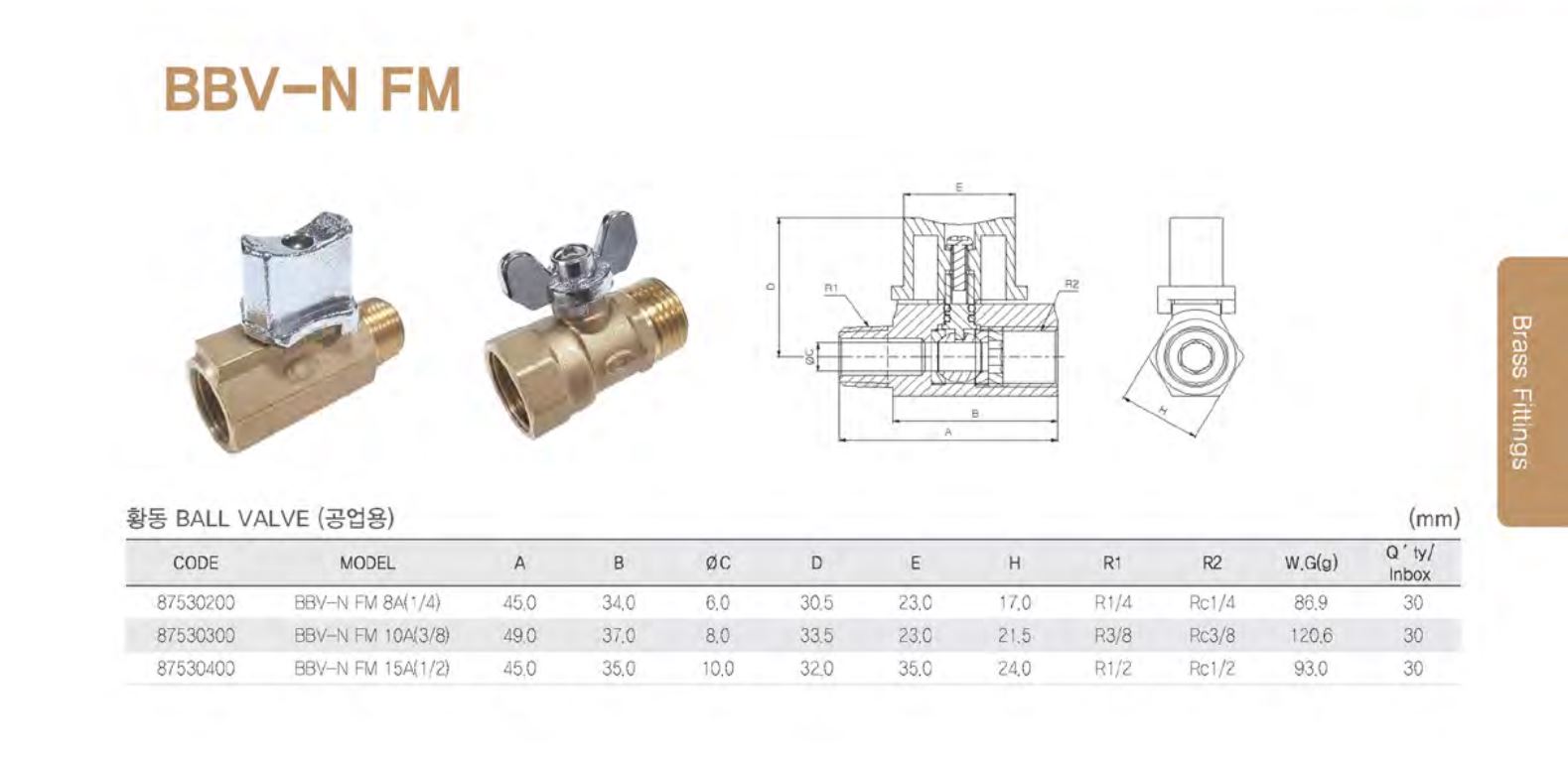 ● 황동 볼밸브 Brass Ball Valve Gas, 공업용 냉, 온수 및 화학약품에 사용됩니다. 밸브의 개폐식별이 용이하고 핸들작동이 원활합니다. 적용 온도 범위가 넓고 내구성이 뛰어납니다. 정밀 가공되어 작동이 부드럽고 기밀이 확실합니다. 스템 및 나사를 CNC가공함으로써 전면에 바리(Burr)가 없으며 배관시 직진도가 완벽하여 시공이 용이합니다. 볼 내경이 크게 설계되어 있습니다. 나사부 길이를 충분히 길게함으로써 시공시 파이프 및 니플 끝 부위가 부딪힘이 없도록 제작되었습니다. 100% 전수량 기밀 테스트 후 공장에서 출고됩니다. |