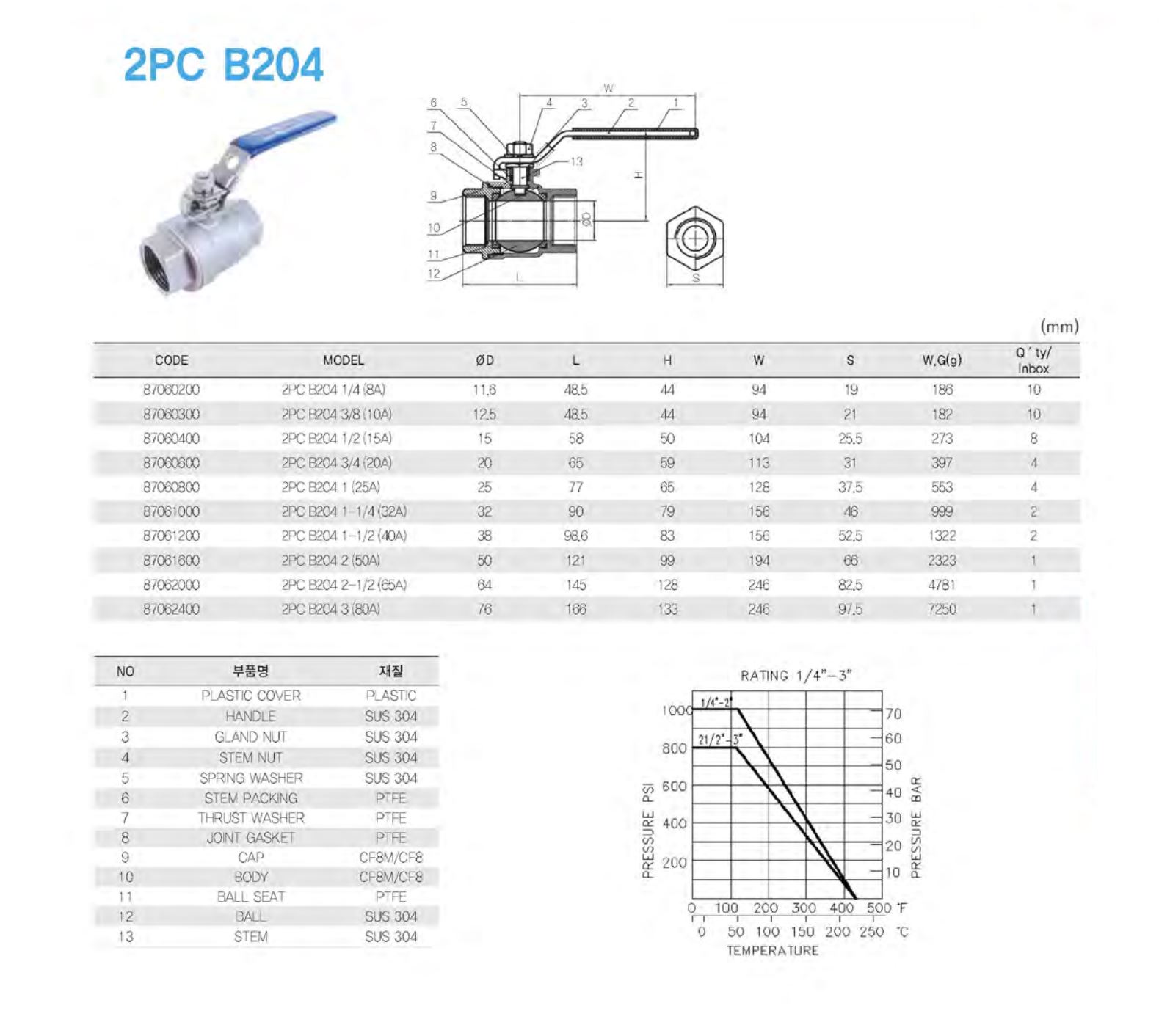 ● 스테인리스 볼밸브 (Stainless Ball Valves) 온냉수 / 스팀 / 음용수용 / 공업용수 / 가스용 / 바닷물(염수) 등에 사용됩니다. 밸브의 개폐식별이 용이하고 핸들작동이 원활합니다. 고급의 스테인리스 재질로 제작되어 광범위한 분야에 사용 가능합니다. 적용 온도 범위가 넓고 내구성이 뛰어납니다. 정밀 가공되어 작도잉 부드럽고 기밀이 확실합니다. 스템 및 나사를 CNC가공합으로써 전면이 바리(BURR)가 없으며 배관시 직진도가 완벽하여 시공이 용이합니다. 볼내경이 크게 설계되어 있습니다. 나사부 길이를 충분히 길게함으로써 시공시 파이프 및 니플 끝 부위가 부딪힘이 없도록 제작되었습니다. 100% 전수량 기밀 테스트 후 공장에서 출고됩니다. |