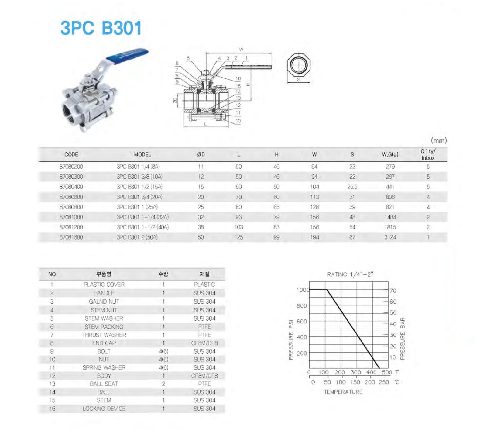 ● 스테인리스 볼밸브 (Stainless Ball Valves) 온냉수 / 스팀 / 음용수용 / 공업용수 / 가스용 / 바닷물(염수) 등에 사용됩니다. 밸브의 개폐식별이 용이하고 핸들작동이 원활합니다. 고급의 스테인리스 재질로 제작되어 광범위한 분야에 사용 가능합니다. 적용 온도 범위가 넓고 내구성이 뛰어납니다. 정밀 가공되어 작도잉 부드럽고 기밀이 확실합니다. 스템 및 나사를 CNC가공합으로써 전면이 바리(BURR)가 없으며 배관시 직진도가 완벽하여 시공이 용이합니다. 볼내경이 크게 설계되어 있습니다. 나사부 길이를 충분히 길게함으로써 시공시 파이프 및 니플 끝 부위가 부딪힘이 없도록 제작되었습니다. 100% 전수량 기밀 테스트 후 공장에서 출고됩니다. |
