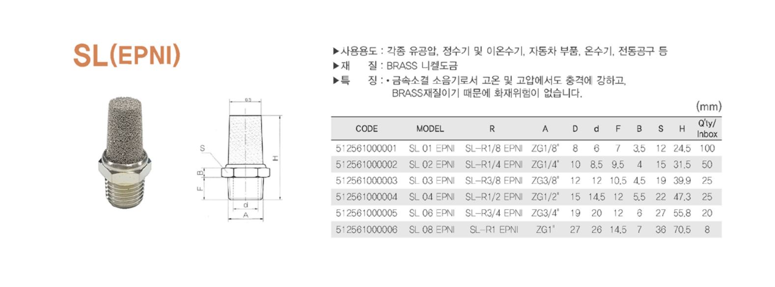 ● 소음기 Silencer 각종 소음이 발생되는 기기의 배기 포트에 설치하여 대기로 배출되는 공기압의 소음을 감소하는데 사용합니다. 소음 효과가 뛰어납니다. 각종 재질에 따라 선택하여 사용이 가능합니다.(BRASS, STAINLESS, STEEL, PLASTIC, AL) 내구성이 오래가며, 사용 장소가 광범위합니다. 콤팩티형이어서 좁은 장소에서도 설치가 가능합니다. |