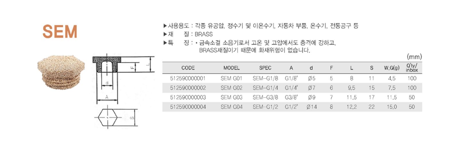 ● 소음기 Silencer 각종 소음이 발생되는 기기의 배기 포트에 설치하여 대기로 배출되는 공기압의 소음을 감소하는데 사용합니다. 소음 효과가 뛰어납니다. 각종 재질에 따라 선택하여 사용이 가능합니다.(BRASS, STAINLESS, STEEL, PLASTIC, AL) 내구성이 오래가며, 사용 장소가 광범위합니다. 콤팩티형이어서 좁은 장소에서도 설치가 가능합니다. |