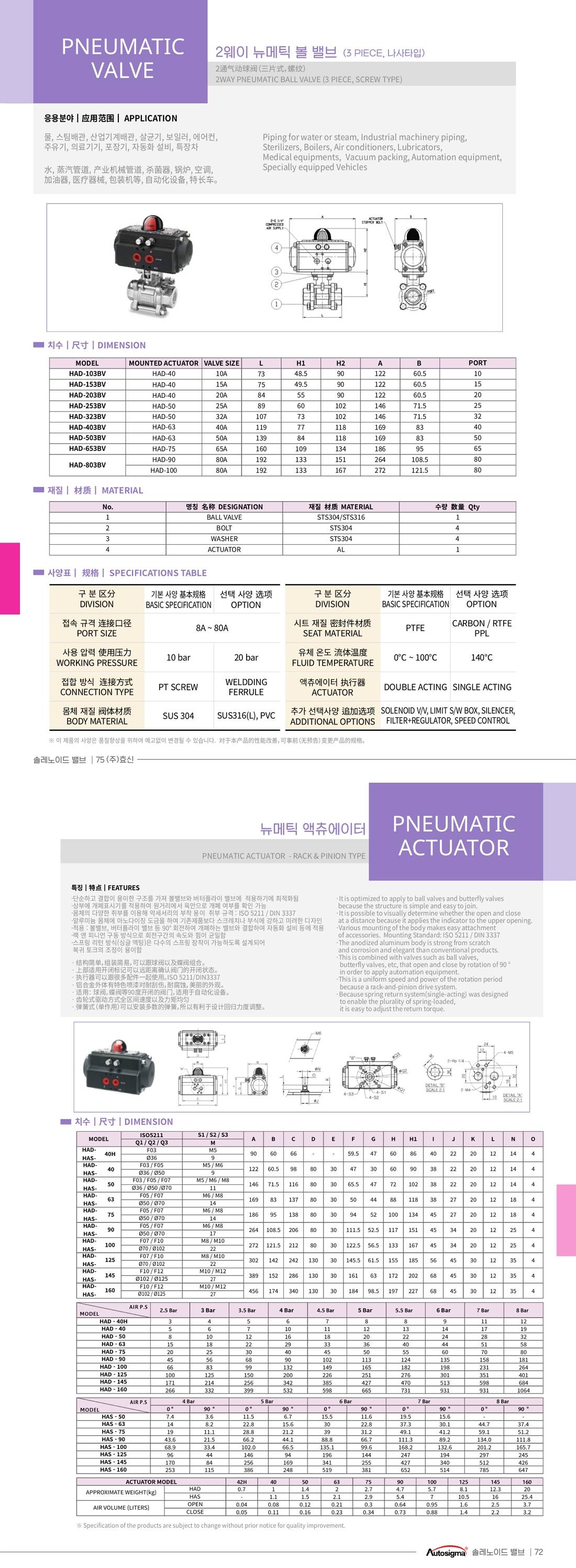 | 체크포인트 | 공급압력에 따라 해당 엑츄에이터 작동값(N) 상이하므로 상세페이지 공급압력표 확인하시어 선정 참조 바랍니다. 예) 배관사이즈 1/2'(15A) 3PCS 뉴메틱엑츄에이터 HAD-153BV 경우 엑츄에이터모델 HAD-40, AIR P.S (공급압력) 5 Bar 시 작동값 12(N) * 단, 유체 상태 (액체, 기체, 분체) 및 라인 진동 유무 등 기타 선정 요인들 함께 충분히 검토 필요 (당사 문의) 출고품은 기본 사양이며, 옵션 적용품 별도 문의 부탁드립니다. |