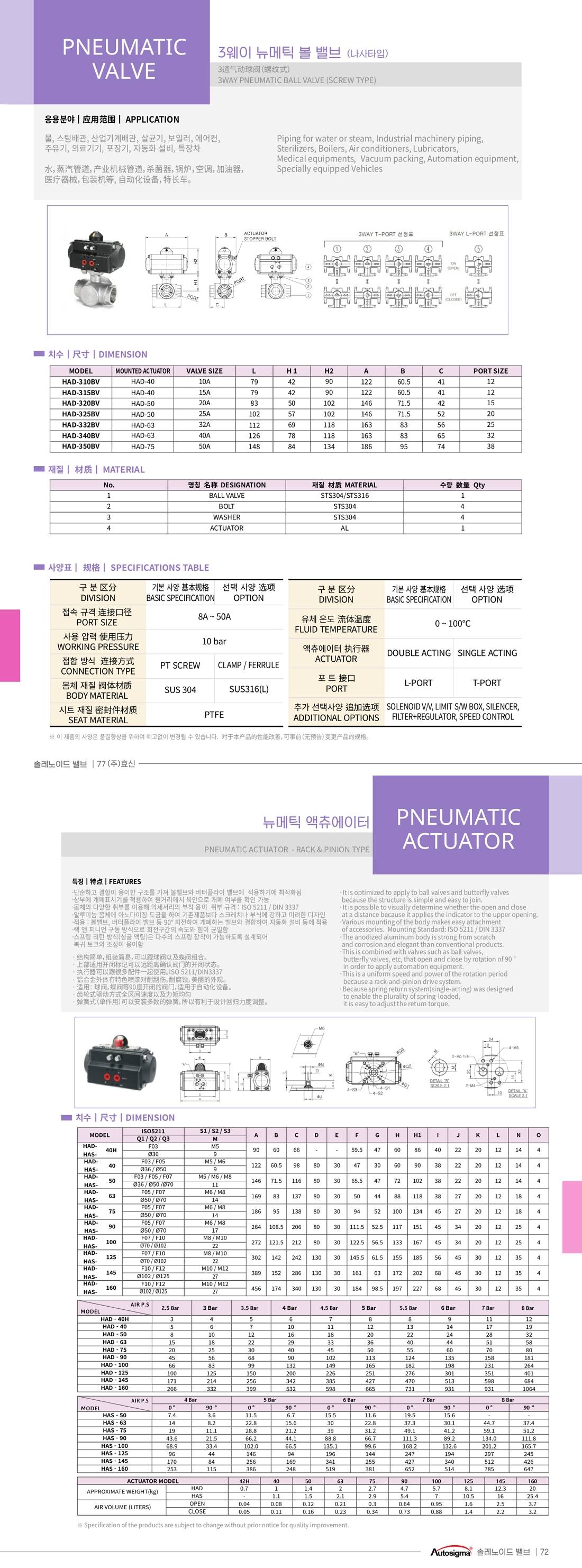 | 체크포인트 | 공급압력에 따라 해당 엑츄에이터 작동값(N) 상이하므로 상세페이지 공급압력표 확인하시어 선정 참조 바랍니다. 예) 배관사이즈 1/2'(15A) 3웨이 뉴메틱엑츄에이터 HAD-315BV 경우 엑츄에이터모델 HAD-40, AIR P.S (공급압력) 5 Bar 시 작동값 12(N) * 단, 유체 상태 (액체, 기체, 분체) 및 라인 진동 유무 등 기타 선정 요인들 함께 충분히 검토 필요 (당사 문의) 출고품은 기본 사양이며, 옵션 적용품 별도 문의 부탁드립니다. |