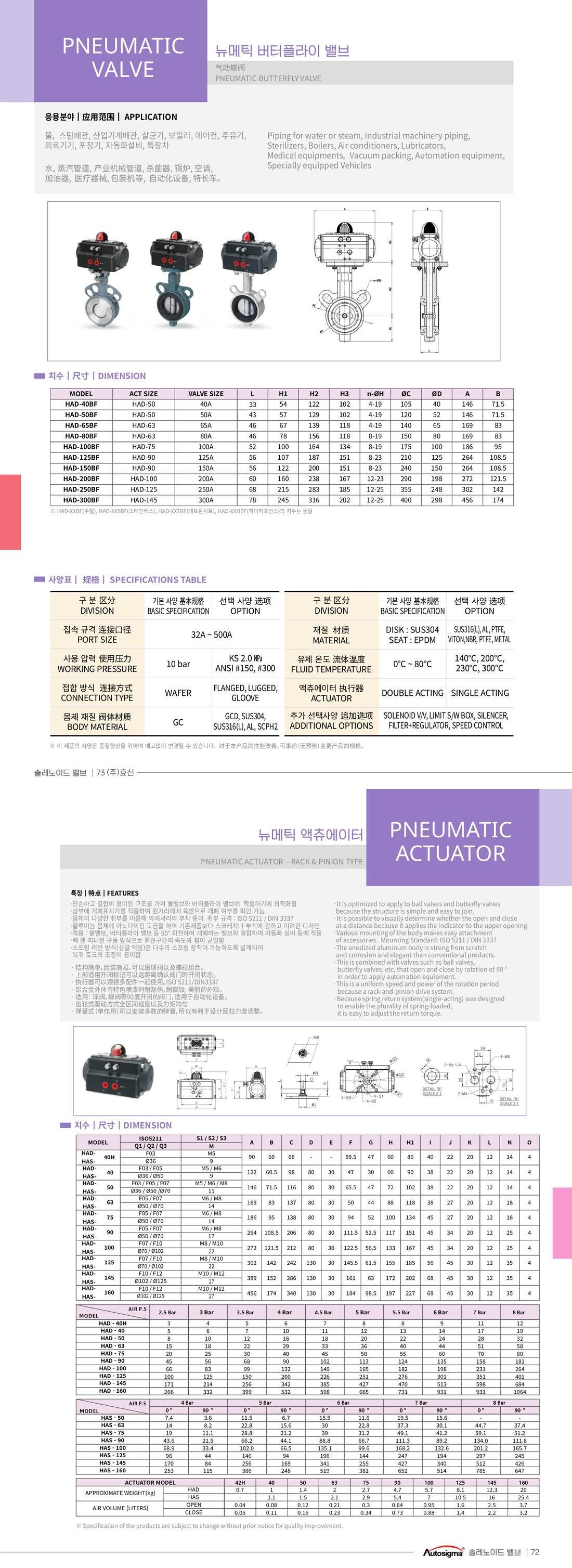 | 체크포인트 | 공급압력에 따라 해당 엑츄에이터 작동값(N) 상이하므로 상세페이지 공급압력표 확인하시어 선정 참조 바랍니다. 예) 배관사이즈 1-1/2'(40A) 버터플라이 밸브 뉴메틱엑츄에이터 HAD-40BF 경우 엑츄에이터모델 HAD-50, AIR P.S (공급압력) 5 Bar 시 작동값 20(N) * 단, 유체 상태 (액체, 기체, 분체) 및 라인 진동 유무 등 기타 선정 요인들 함께 충분히 검토 필요 (당사 문의) 출고품은 기본 사양이며, 옵션 적용품 별도 문의 부탁드립니다. |