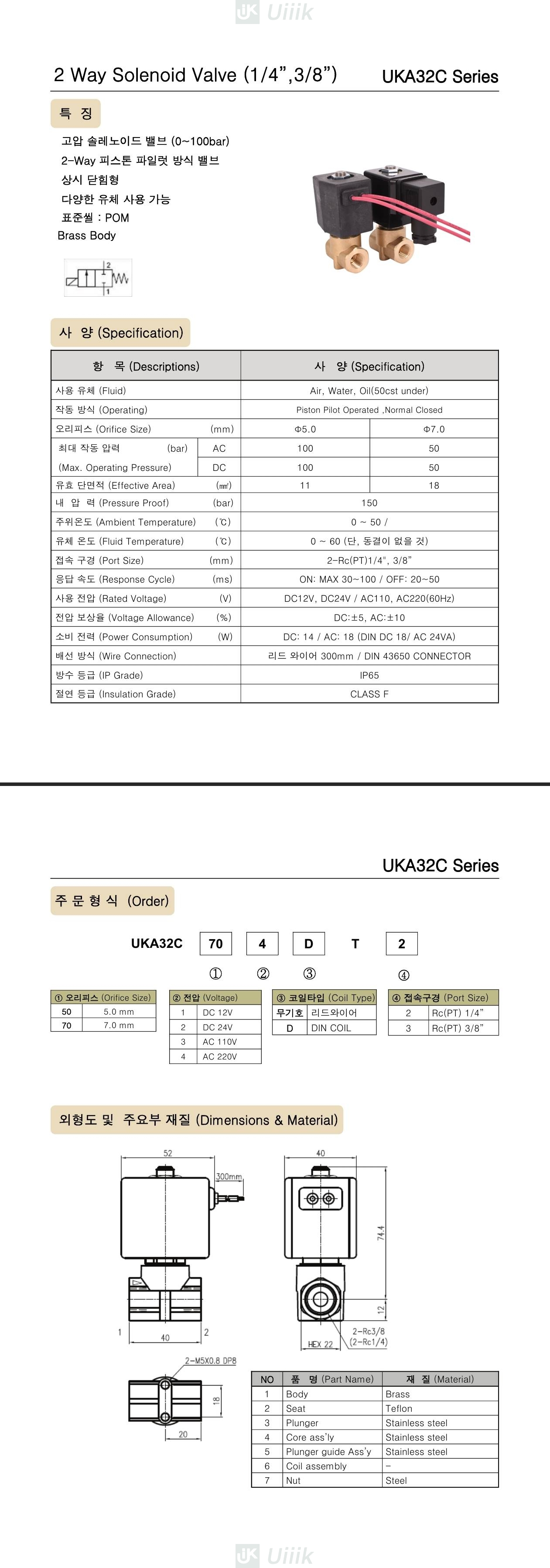 [UKA32C 시리즈] 소형 직동식 1/4(8A), 3/8(10A), Max 100 Bar, IP65 리드와이어 코일 + 딘코일 옵션