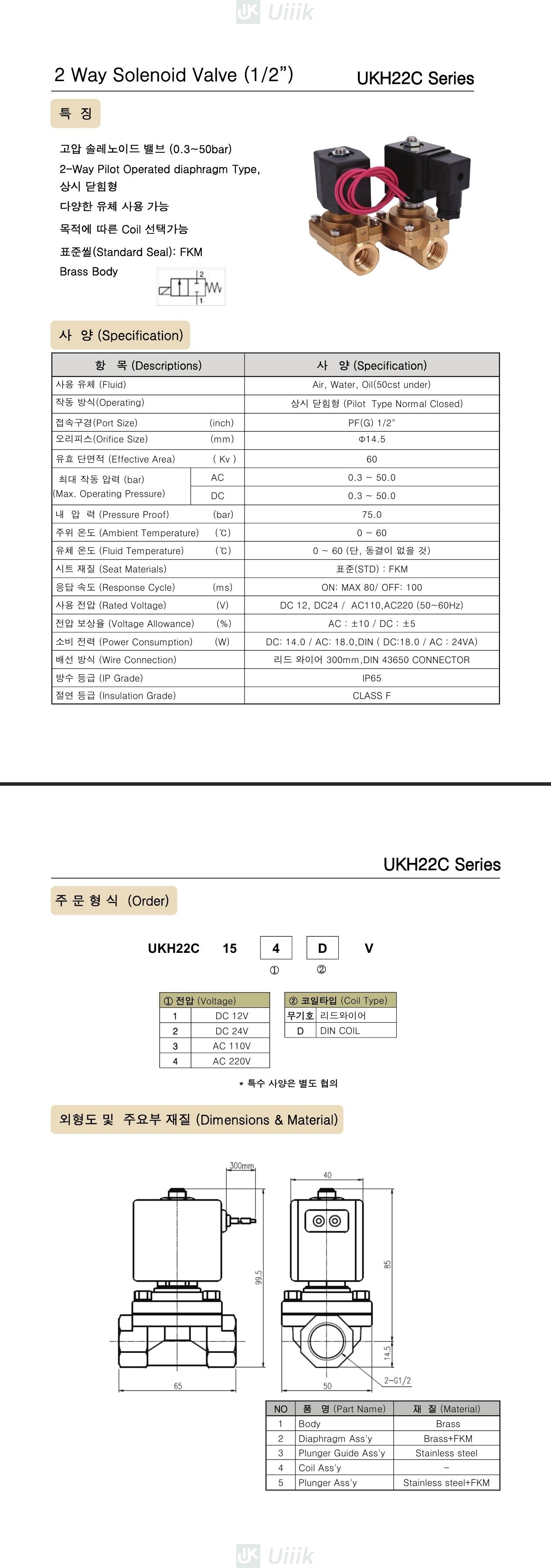 [UKH22C 시리즈] PF(G) 1/2(15A), Max 50 Bar, IP65 리드와이어 코일 + 딘코일 옵션