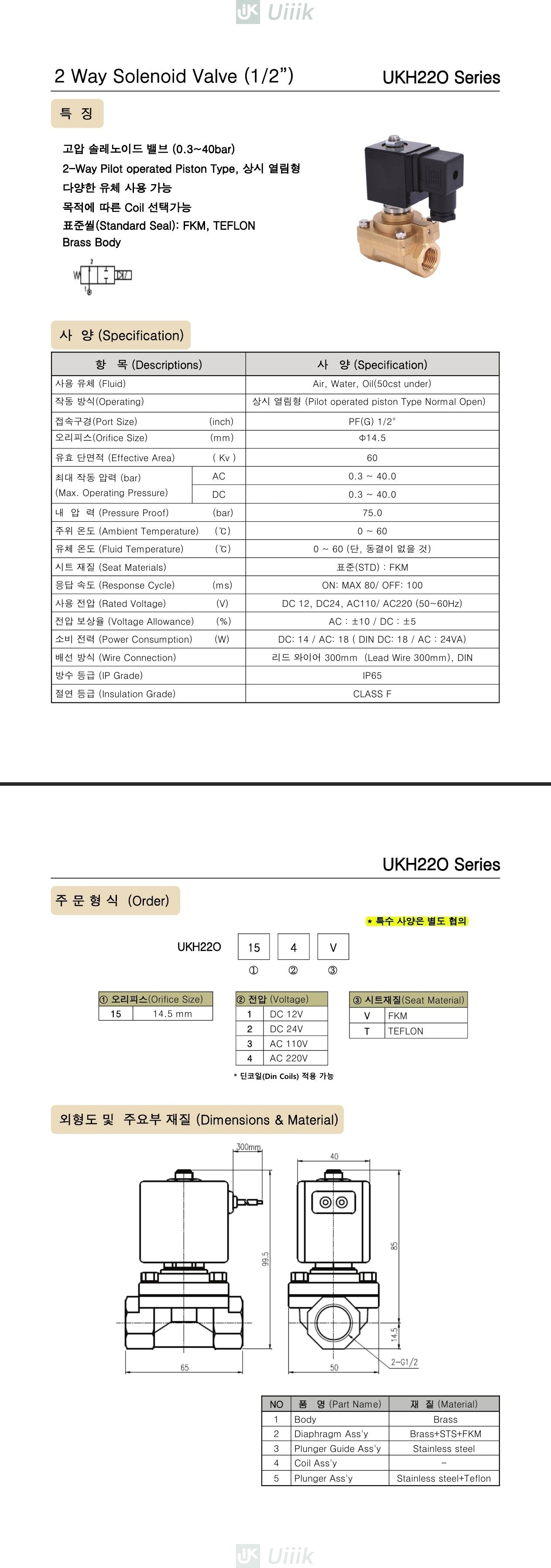 물 공기 기름 황동 FKM 1/2 (15A) 14.5 AC220V/60Hz min 0.3 max 40 리드와이어 3일 UKH22O004