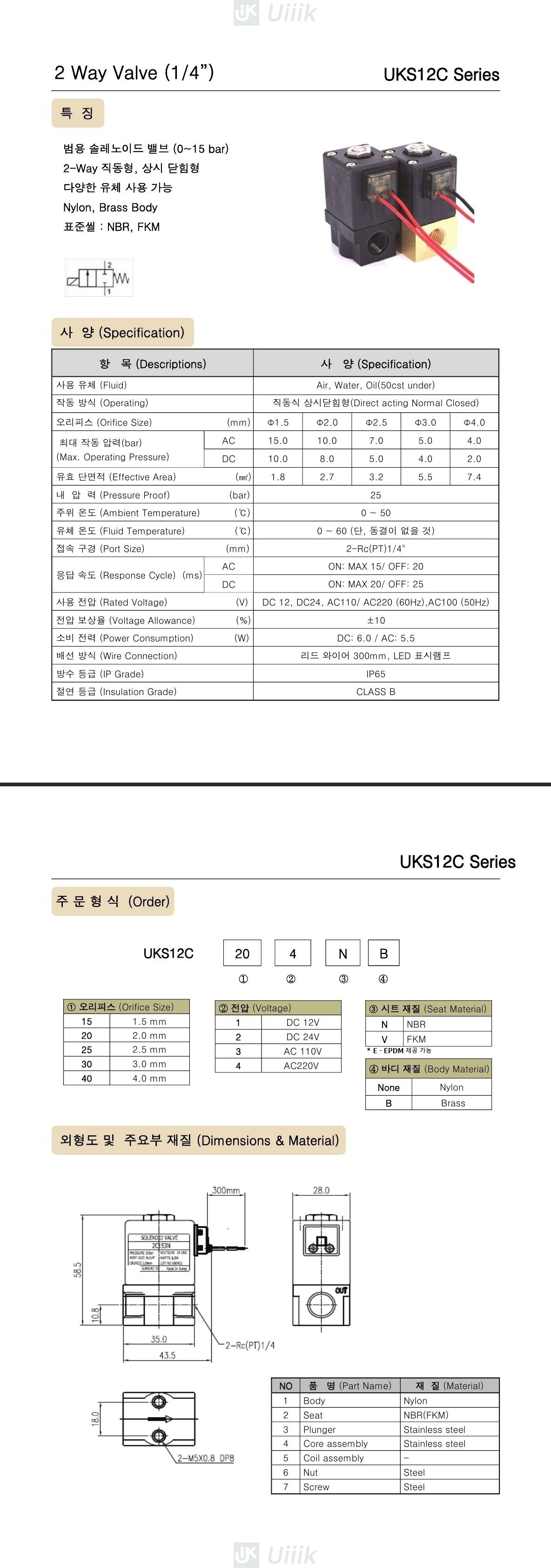 [UKS12C 시리즈] 황동바디 소형 직동식 1/4 (8A), IP65 리드와이어 램프코일