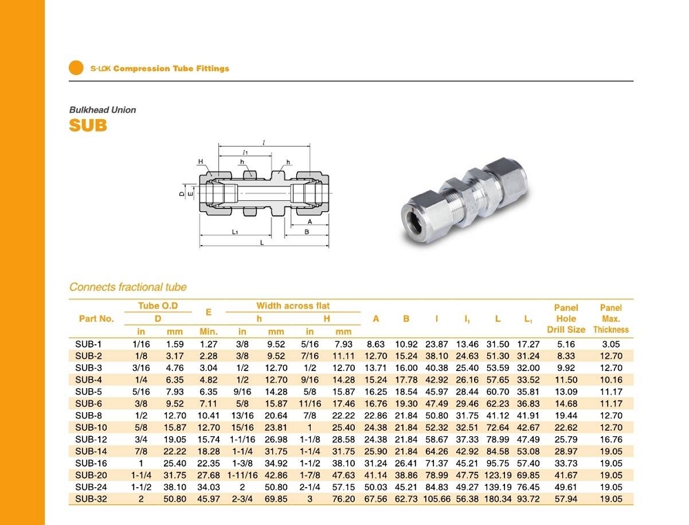 SUB 시리즈 벌크헤드 유니온 / inch 튜브