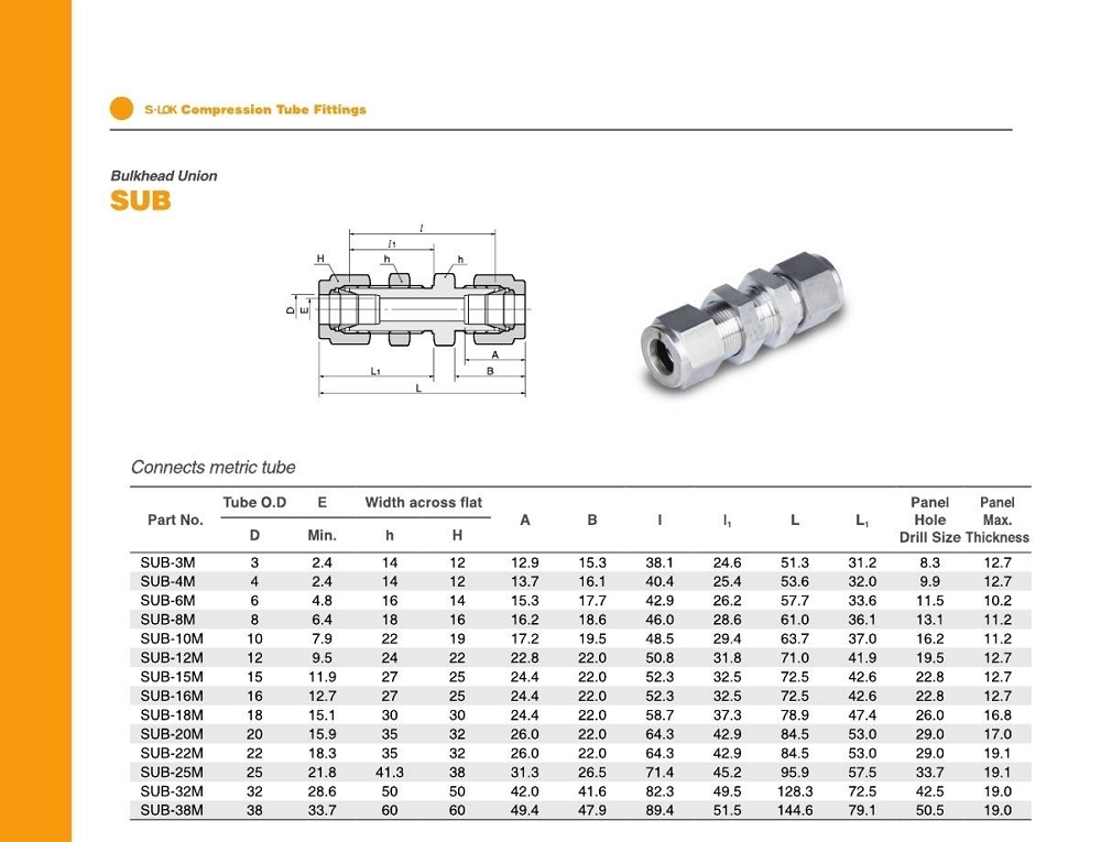 SUB 시리즈 벌크헤드 유니온 / mm 튜브용
