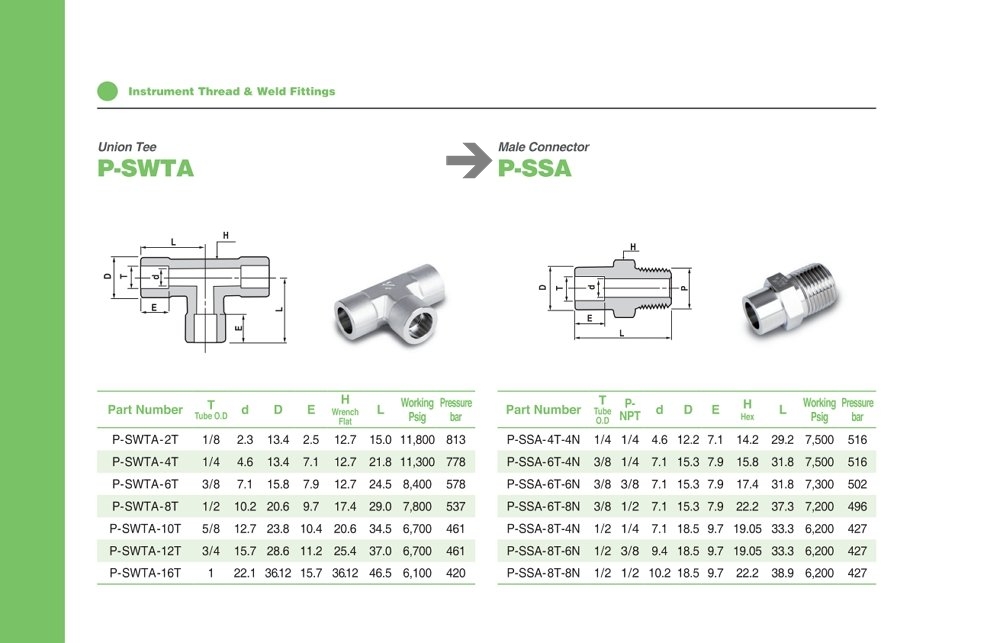 INSTRUMENT PIPE FITTINGS 사이즈 1/8 ~ 2 인치 파이핑 Stainless steel 316 NPT, ISO/BSP, SAE threads ASME B31.1 & B31.3 Rolled male threads (캡 보호) Leak-proof & reliable systems Stainless steel 316 Metric tube O.D and pipe O.D |