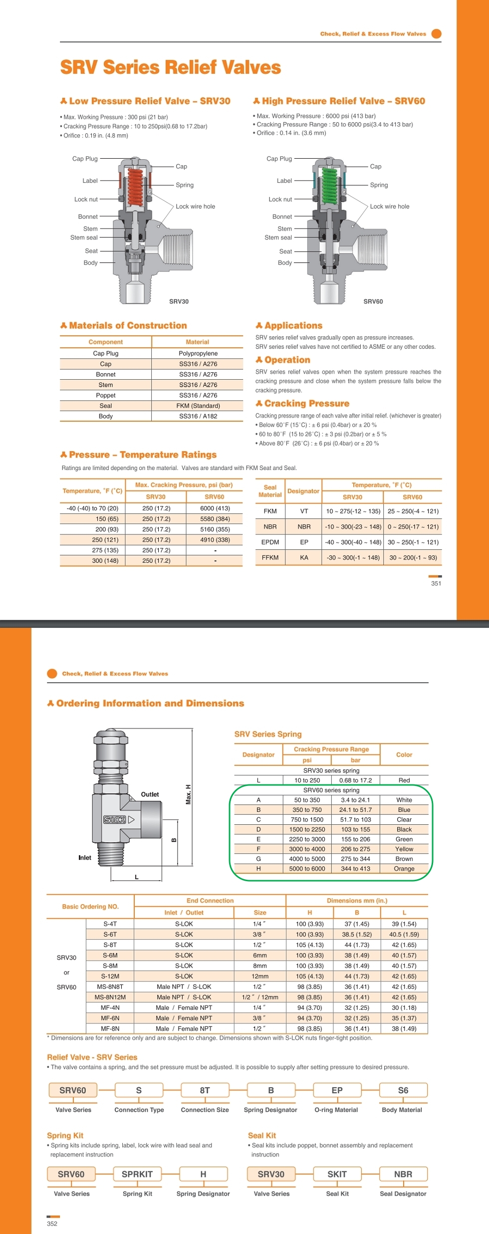Relief Valves 압력: up to 6000psi (413bar) @ 100ºF (38ºC) 온도: 0ºF (-17ºC) to 250ºF (121ºC) 재질: Stainless Steel Cracking pressure: 250psi (17.2bar) to 6000psi (413bar) 사이즈: 1/4 to 1/2 in. tubing and piping |