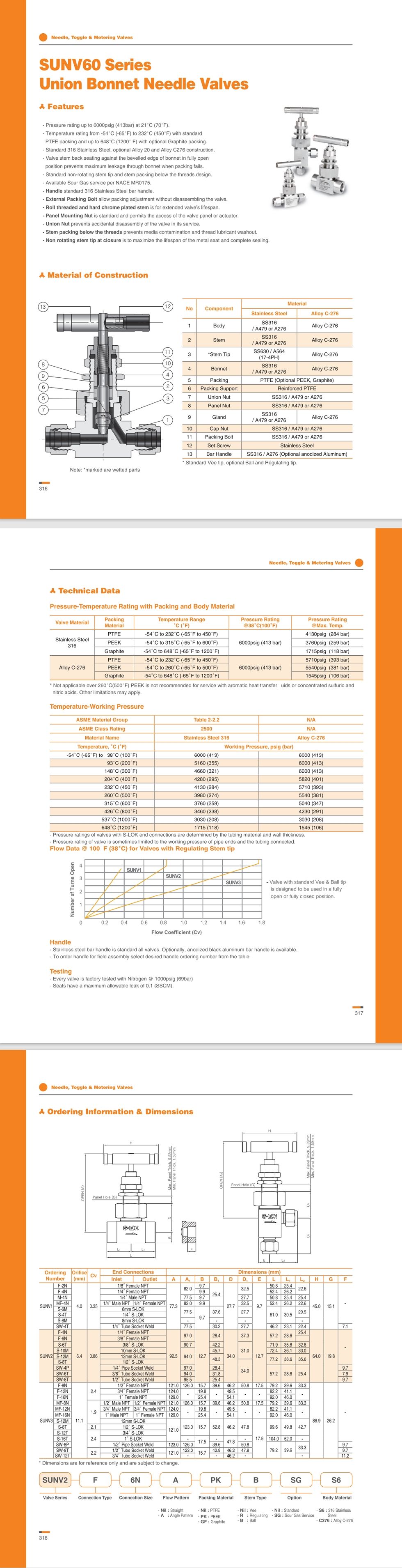 SUNV60 시리즈 / 유니온 보닛 니들 밸브 up to 6000 psi (SS316 재질)