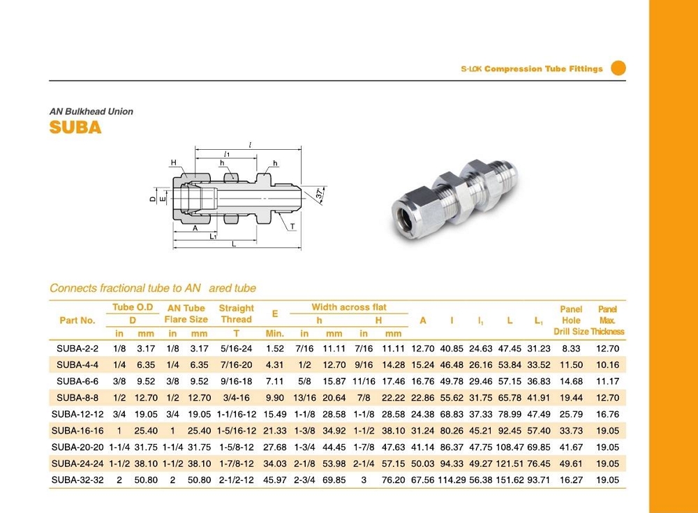 SUBA 시리즈 AN 벌크헤드유니온 / inch 튜브 - 수나사 37° Flare 튜브