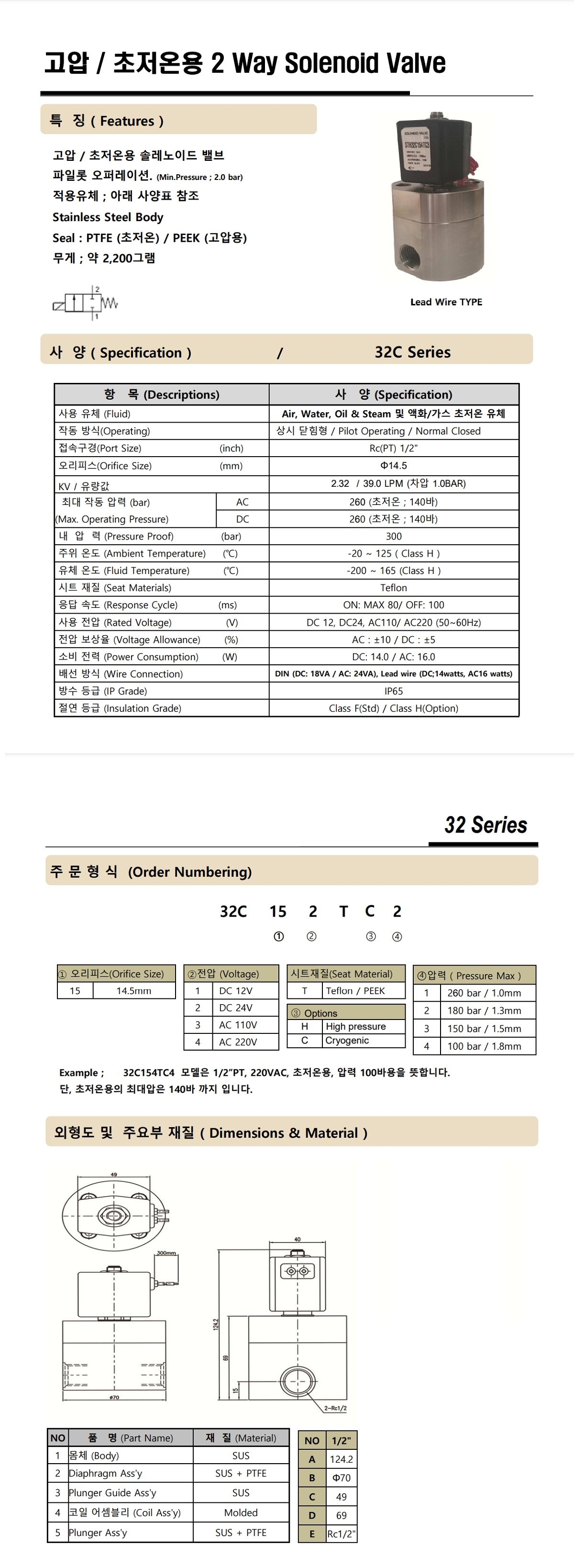 2 way 파일럿오퍼레이팅 방식, 상시닫힘형 저온유체, 고온수 용 딘코일 IP65 CE |