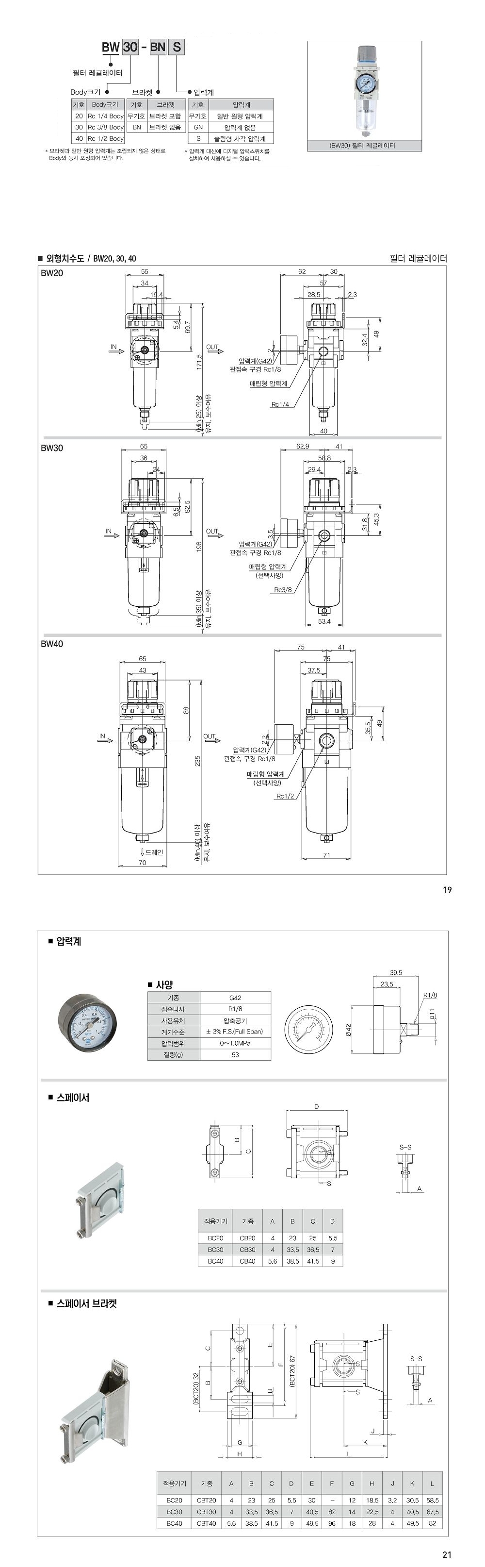 BW 시리즈 필터레귤레이터일체형 / Rc(PT) 1/4~1/2 , 0.5~7 Kgf/cm2