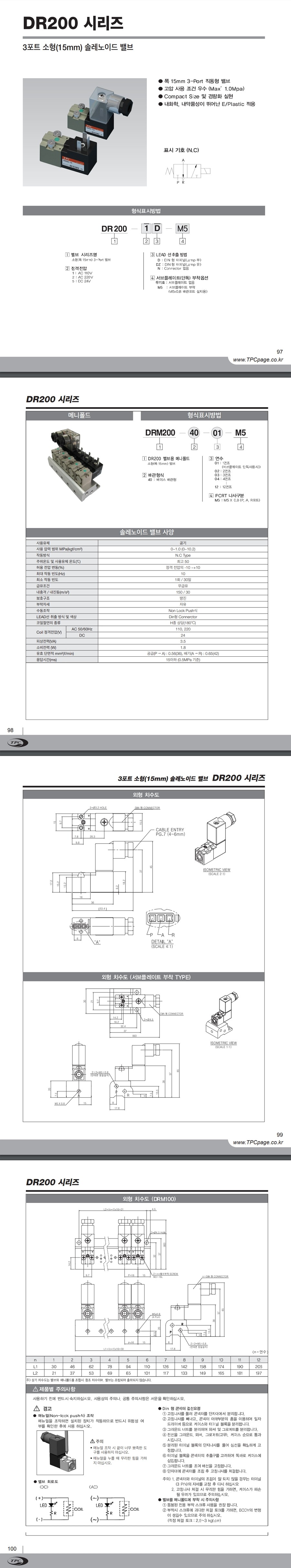 TPC DR200 시리즈 3포트 소형 솔레노이드 밸브 폭 15mm 직동형 큰 밸브 용량 Cv 1.2 (Rc1/4) 고압 사용 조건 우수 max 10 bar 컴팩트 사이즈 및 경략화 실현 내화학 내약품성 우수 |