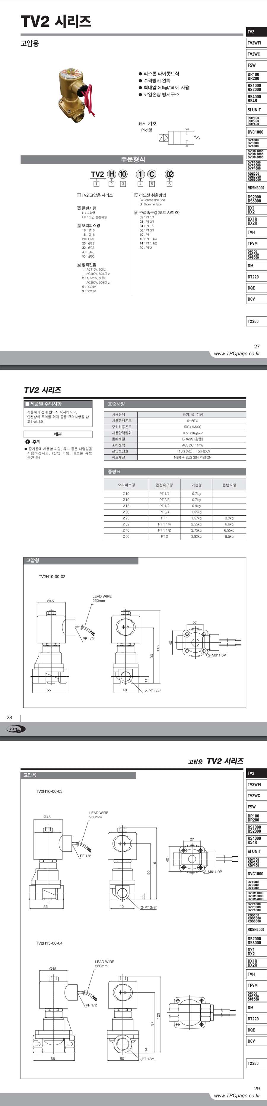 TPC TV2H 시리즈 고압용 피스톤 파이롯트식 2포트 밸브 max 20 bar 수격방지 완화 코일손상 방지구조 자유로운 부착자세 |