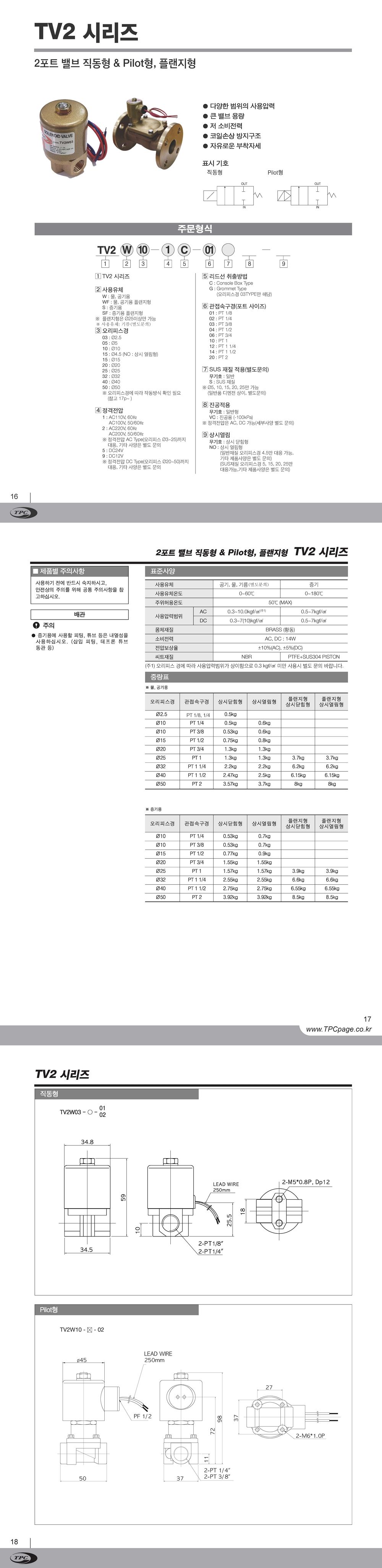 TPC TV2 시리즈 범용 2포트 밸브 직동형 다양한 범위 사용 압력 큰 밸브 용량 저 소비전력 코일손상 방지구조 자유로운 부착자세 |