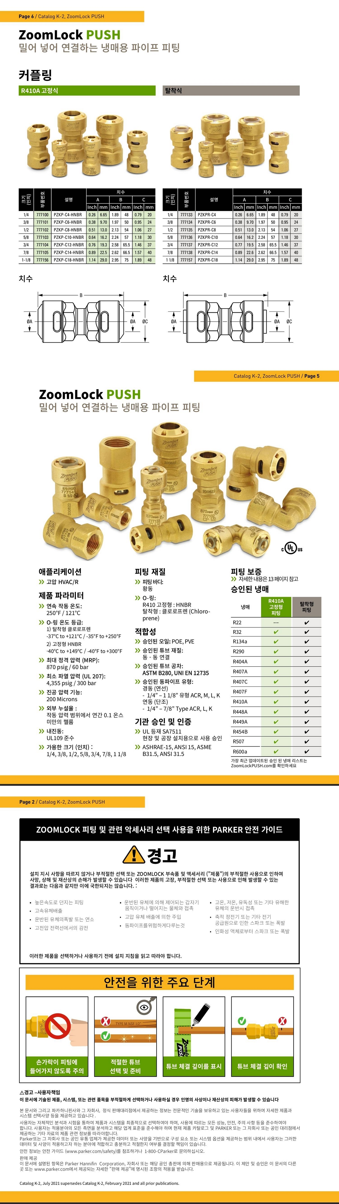 줌락 푸쉬 ZoomLock PUSH - 최대 정격 압력 860 psig / 60 bar - 연속 작동 온도 121도씨 - 프레스 공구 필요 없슴 - 빠르고 쉬운 설치 - 더욱 깨끗한 시스템 설치 - 누설 없는 안전한 연결 - 화재 위험 없슴 (열간 작업 허가 필요 없슴) - 질소 퍼지 불필요 - 작업 현장에 대한 유연한 대응 가능 |