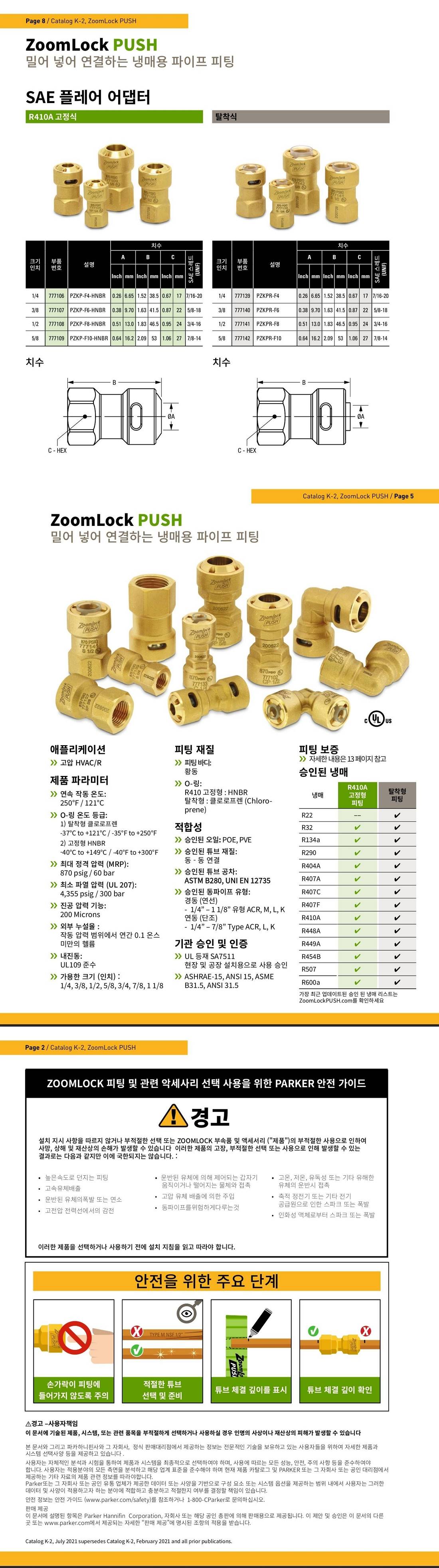 | 체크포인트 | 탈착 불가능 고정형 피팅입니다. 줌락 피팅 사이즈는 ACR용 (HVAC/R 고압용) 동관 사이즈 기준으로 참고 선정 바랍니다. |